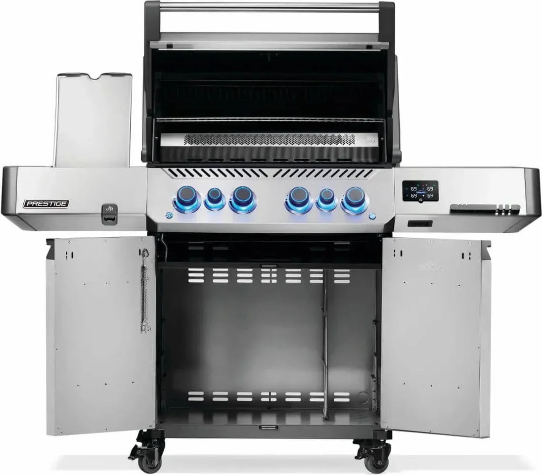 Upgrade your gas grill with the Napoleon Prestige 500 Connected Gas Grill. With Wi-Fi and Bluetooth connectivity, you can easily monitor temperatures, set timers and receive high-temperature warnings all from your phone. The LCD display and temperature probes ensure precise BBQ, while the infrared sear station and larger rotisserie burner enhance performance. LED Control Knobs with SafetyGlow™ technology add a touch of safety and style.